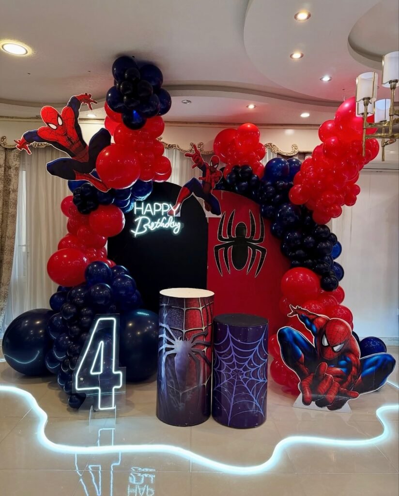 Cardboard cutouts of Spiderman in action add a heroic touch. A glowing “Happy Birthday” sign lights up the celebration. The number “4” in neon lights highlights the special age.