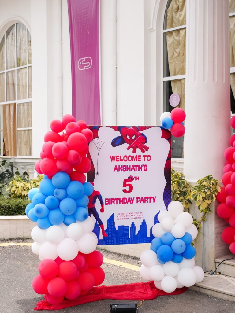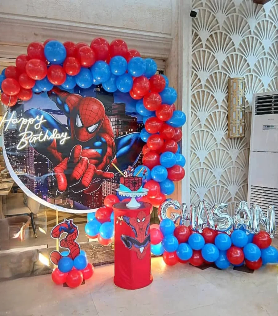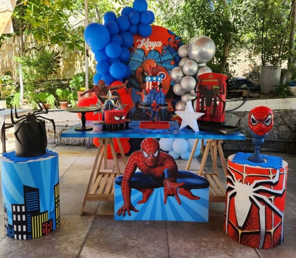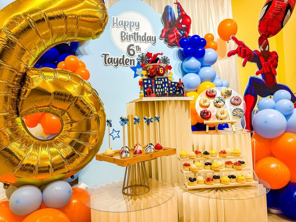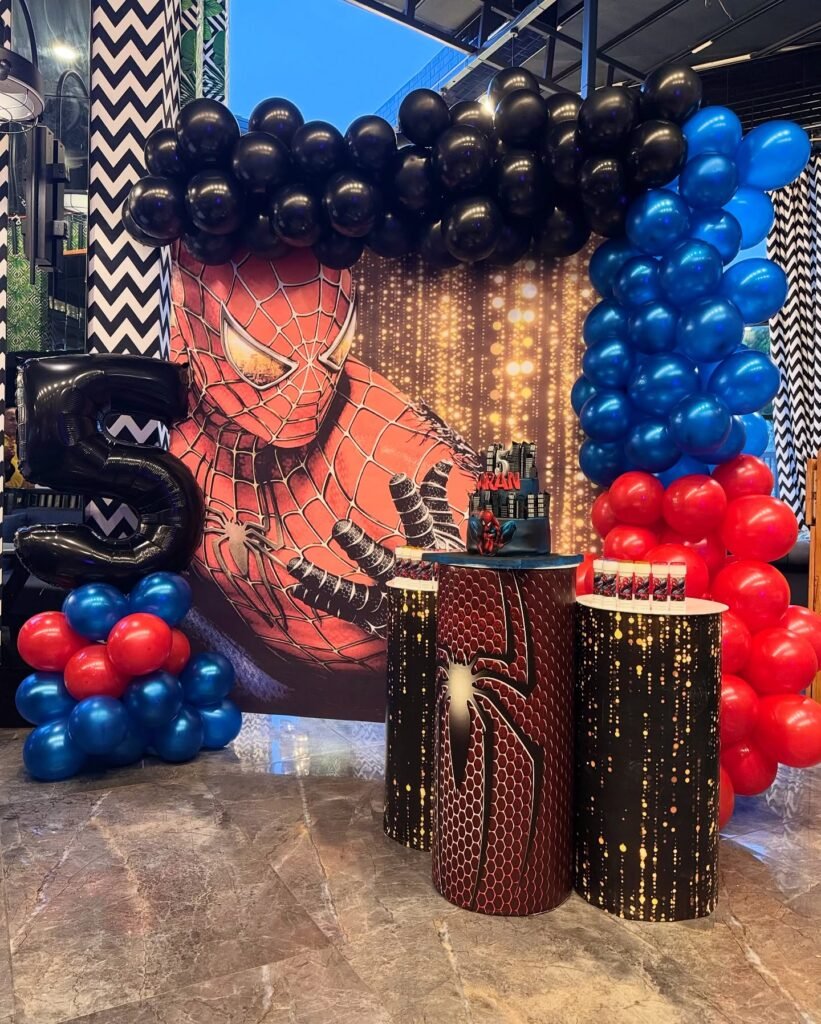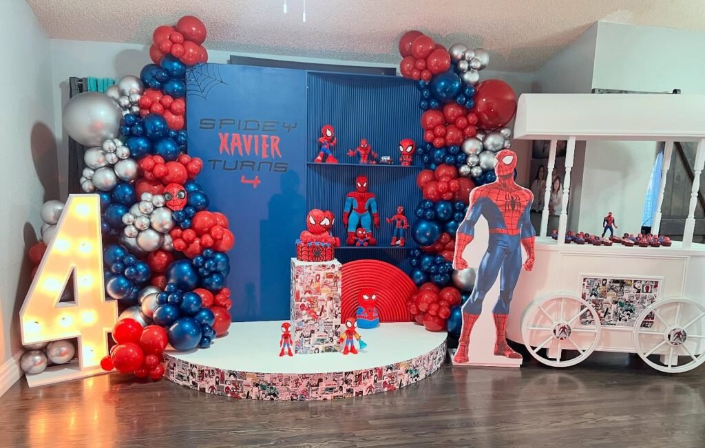 A life-sized Spiderman cutout greets everyone. The whole arrangement feels energetic and fully immersive. It’s a fantastic way to celebrate a special day.