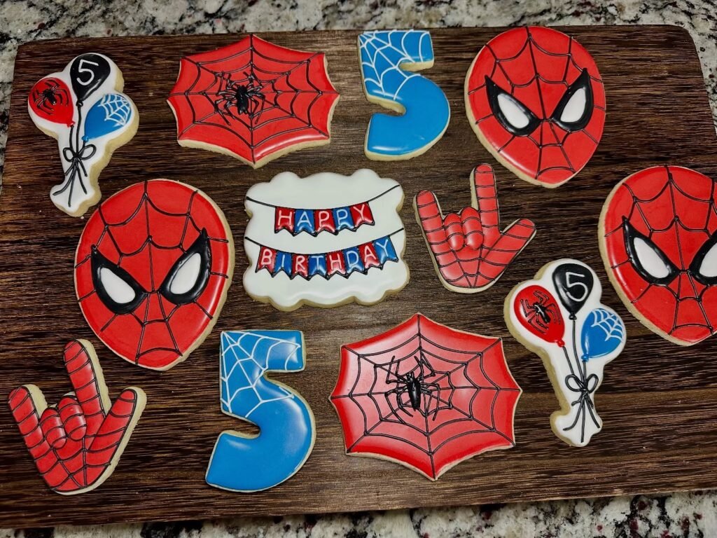 The cookies are decorated with intricate details and vibrant colors. There are also cookies shaped like spiderwebs and the number “5”. This is a great way to have personalized and delicious desserts.
