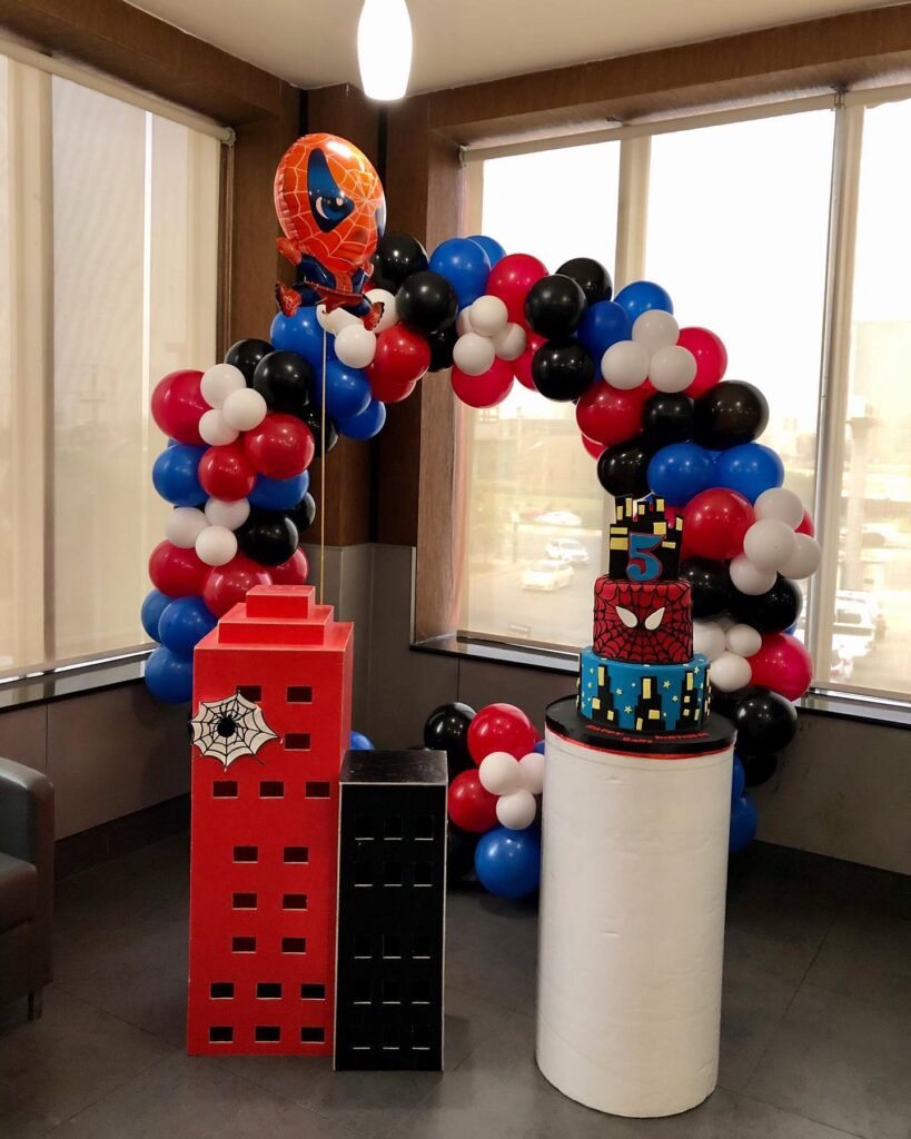 A tiered cake stands on a web-themed pedestal. A tall balloon arch in black, blue, and red frames the entire setup. A large number “5” balloon completes the look.