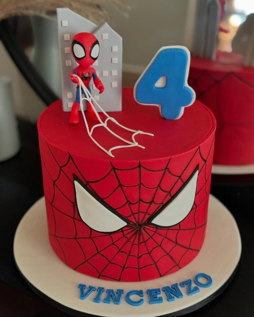 A cute Spiderman figure stands ready to swing into action. A fondant number “4” and the birthday boy’s name add a personal touch. The cake is perfectly sculpted and looks delicious.