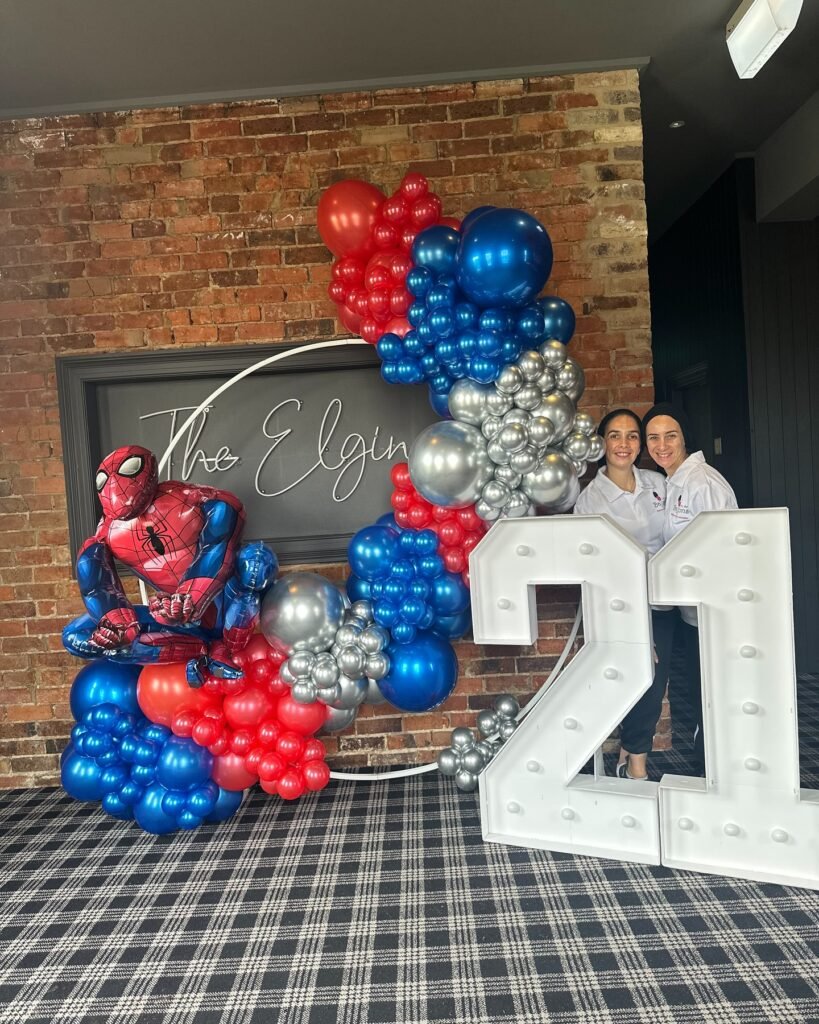 A large Spiderman foil balloon anchors the arch, adding a playful touch. The elegant “21” marquee lights celebrate a milestone birthday. This blend of fun and sophistication makes for a memorable event.