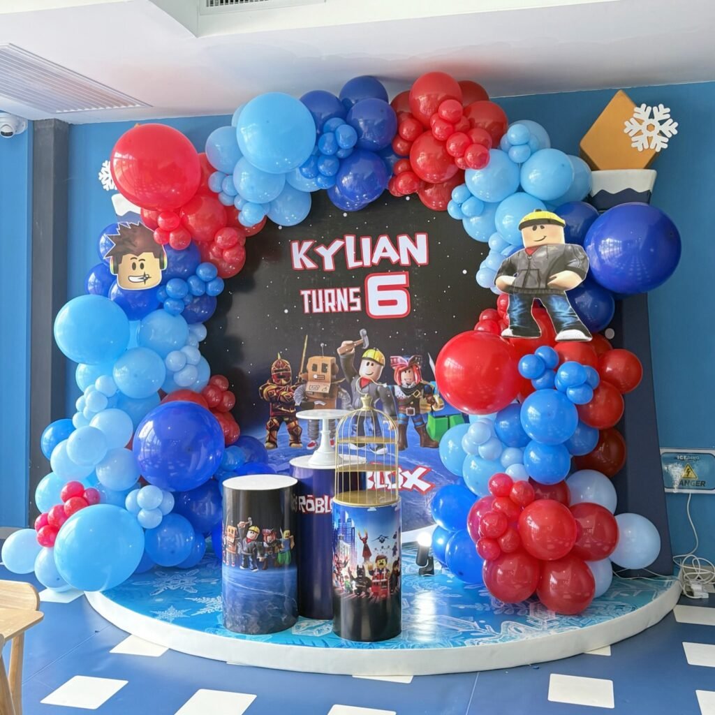 This party setup brings the world of Roblox to life. A custom backdrop features favorite characters, creating an immersive scene. The red and blue balloon arch adds a vibrant, playful feel.