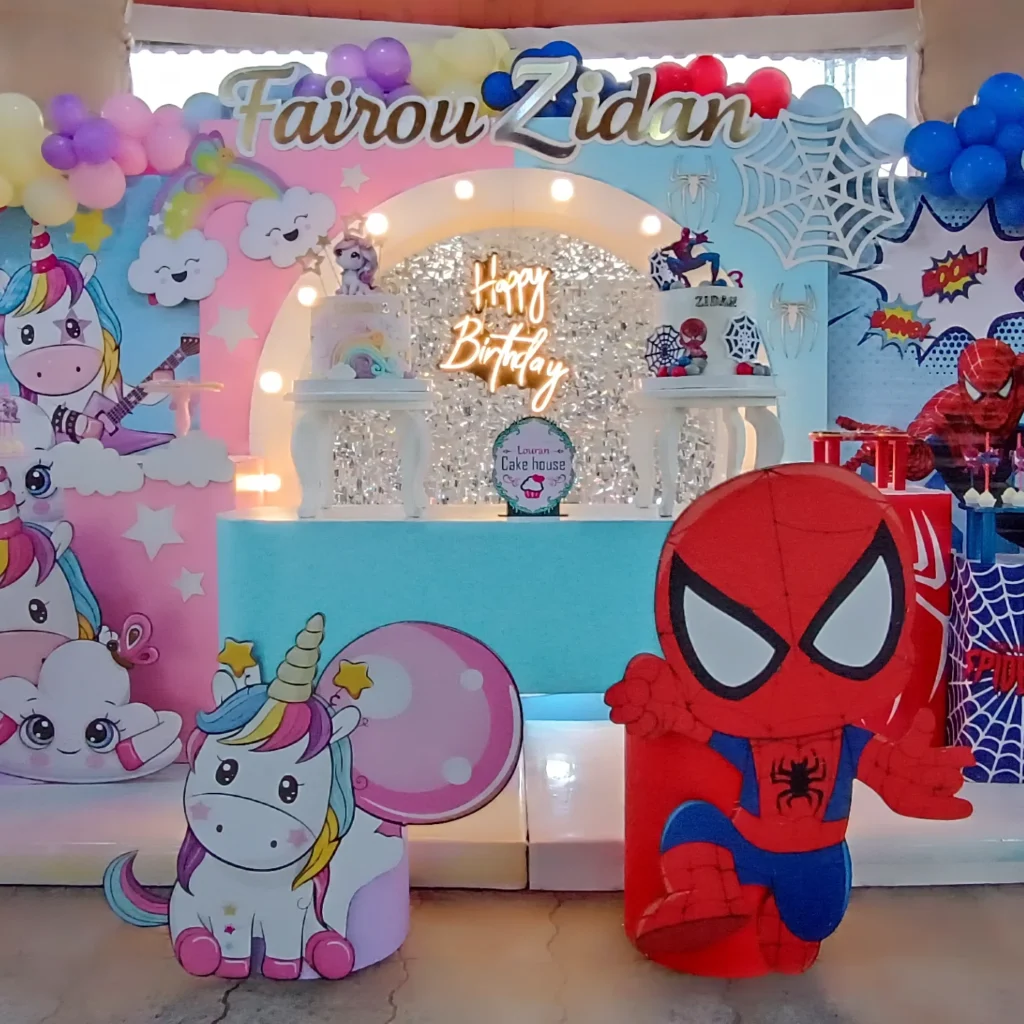 This unique party setup brilliantly combines two beloved themes. One side features enchanting unicorns and rainbows in pastel colors. The other side is a dynamic tribute to Spiderman, showcasing both spiderman birthday party ideas and magical unicorn fun.