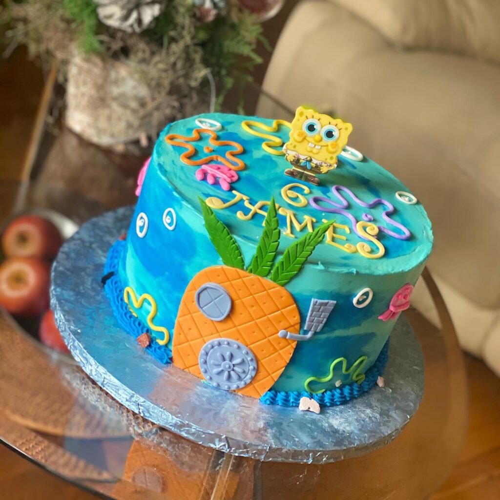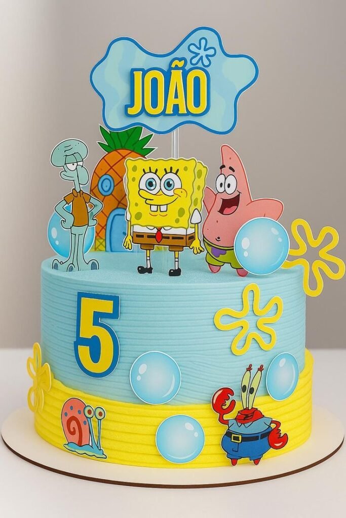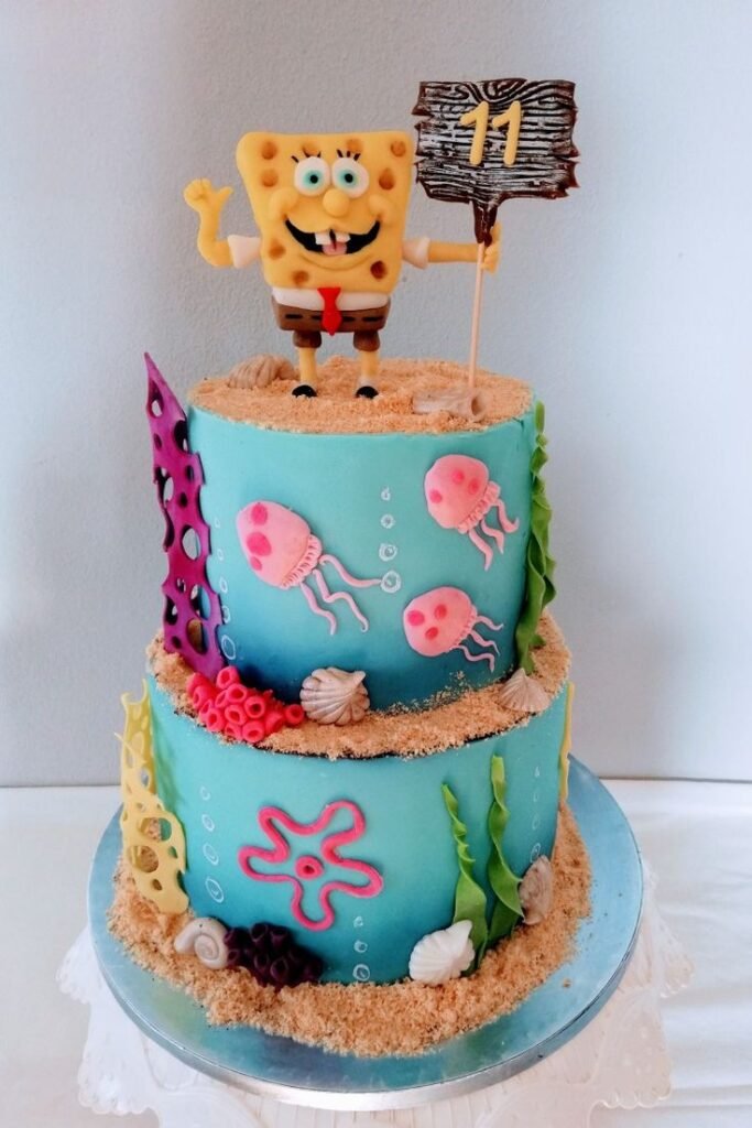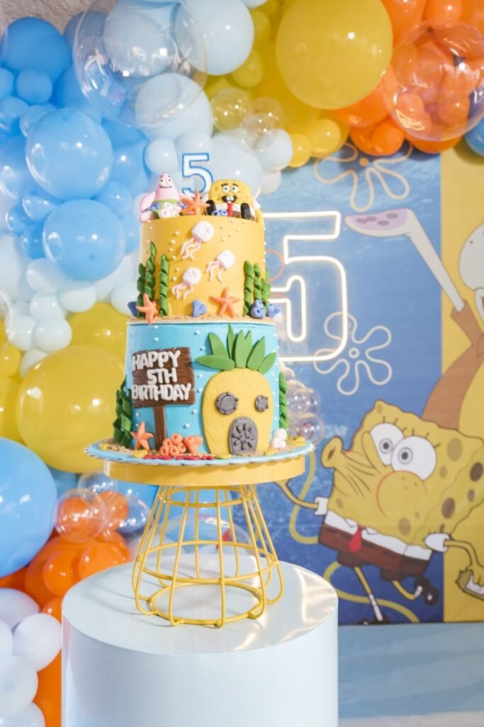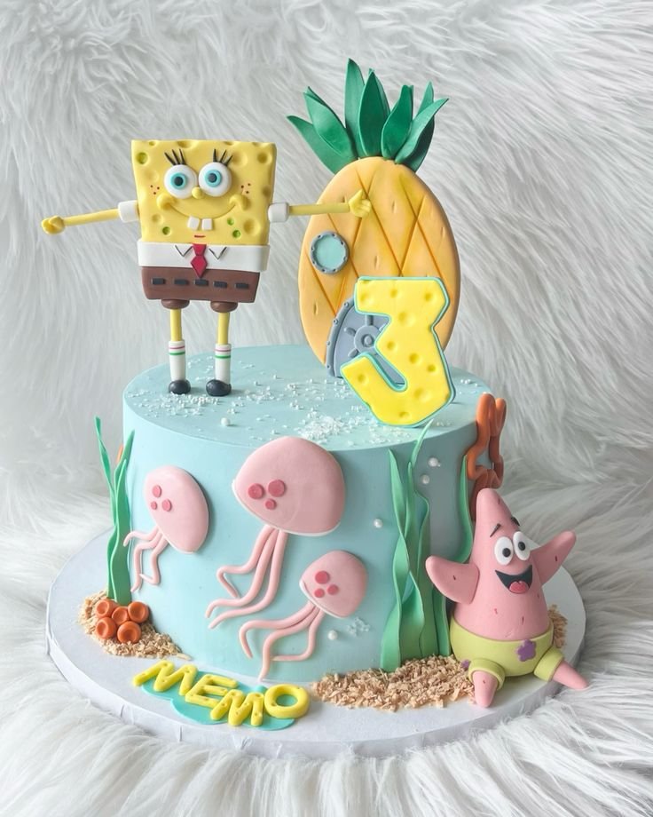 A SpongeBob-themed cake can instantly light up the party with bright colors, playful designs, and everyone’s favorite characters like Patrick, Squidward, and even Gary the snail.