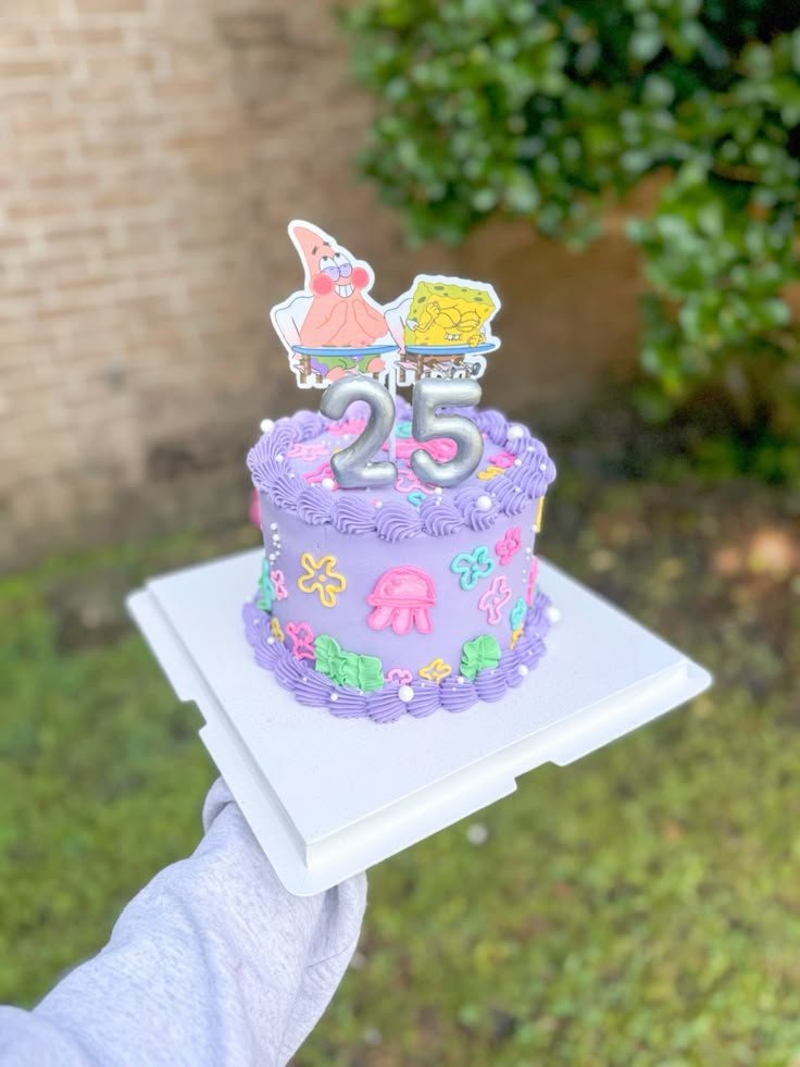 The top is adorned with a shiny number 25. Next to the number are smiling cutouts of SpongeBob and Patrick. They add a fun, humorous touch to the design.