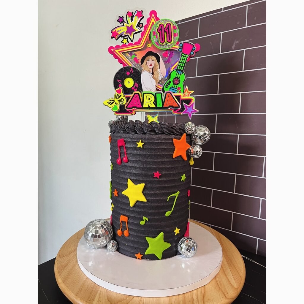 The “ARIA” topper adds a personal touch while keeping that superstar energy alive. With its dark, dramatic base covered in bright pops of color, this cake captures the excitement and energy of a live Taylor Swift performance perfectly.