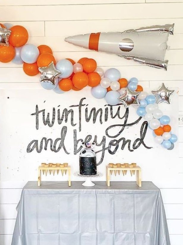 This fun space themed party is one of the top twins birthday themes. The spectacular “Twinfinity and Beyond” cosmic parents lettering adds a one-of-a-kind Zing!