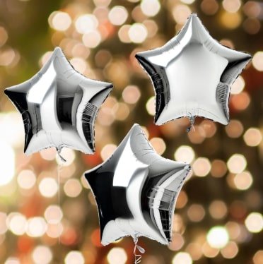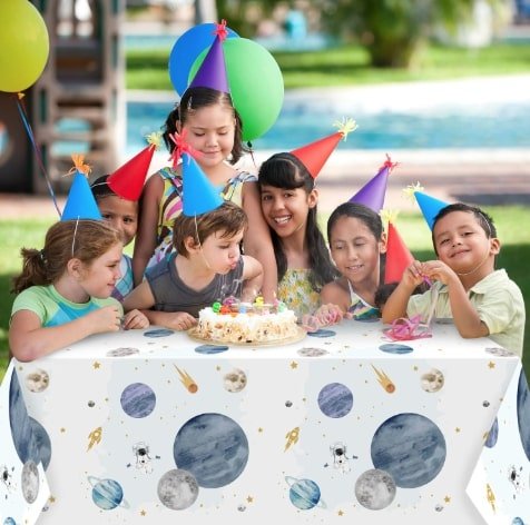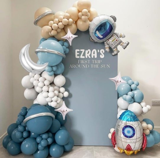 A colorful balloon garland with silver stars and a large rocket will get kids ready for some fun. The colors — bright orange and soft blue — are ideal for a gender-neutral celebration.