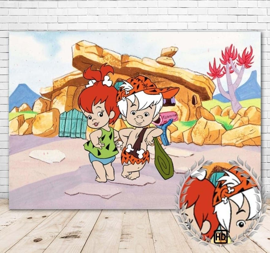 The dessert pedestals feature classic Flintstones patterns like rocks and spots. Each twin has dedicated colors, with pink for Pebbles and orange for Bamm Bamm.