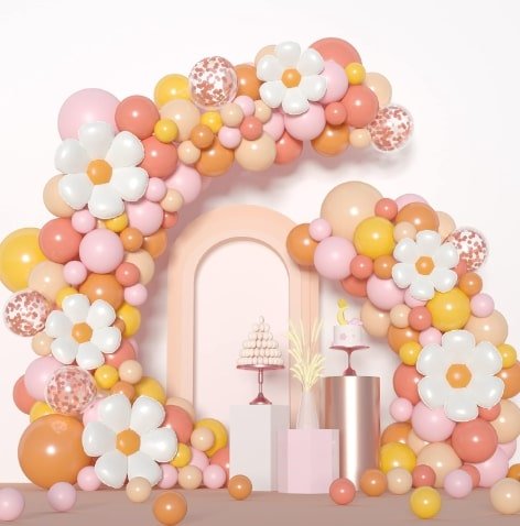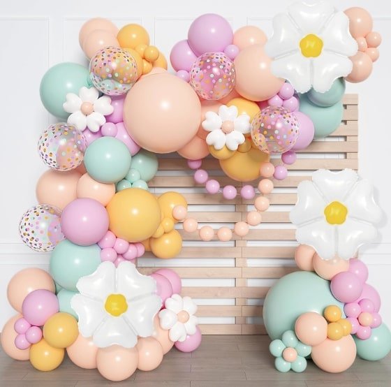 Phoebe’s floral side is a gorgeous arrangement of pink, yellow, and white balloons shaped like huge daisy flowers. A large, illuminated number one joins the two unique concepts.