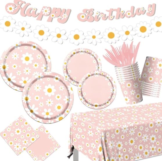 The low tables with bright place settings complete this charming setup. This cheerful, flower-power design is sure to make any joint celebration memorable and fun.