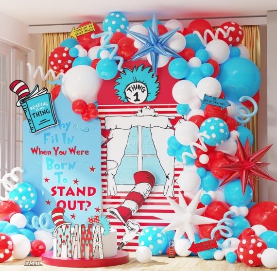 This vibrant setup is a classic among twins birthday party themes. The red, white, and blue balloon arch frames a whimsical Dr. Seuss backdrop.