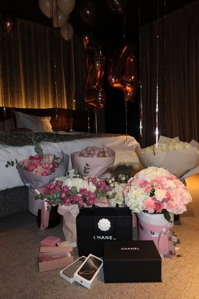 Luxury brand gift boxes, including Chanel, and what appear to be new iPhones, complete this grand gesture. This thoughtful combination of stunning aesthetics and desired items ensures her birthday is celebrated with immense joy and unforgettable extravagance.
