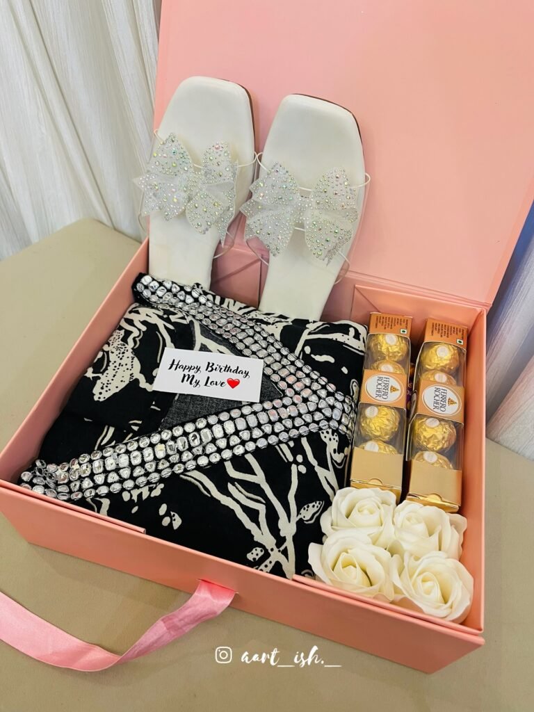 Surprise your wife with a thoughtful collection designed for relaxation and joy. This beautifully curated birthday gift box features comfortable, stylish slides adorned with sparkling bows, perfect for unwinding at home or adding a touch of glamour to her casual wear. She’ll appreciate the blend of comfort and elegance.