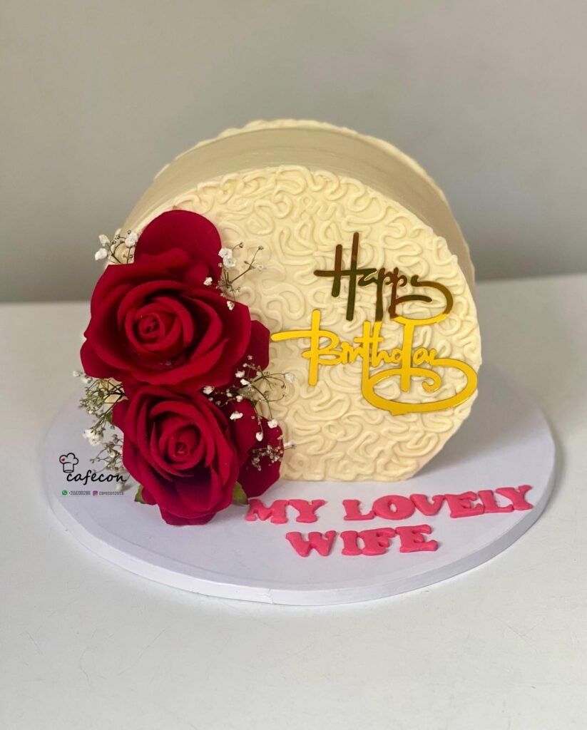 Surprise your wife with a beautifully decorated birthday cake, a delightful centerpiece for her celebration. The cake features a sophisticated cream-colored frosting with an intricate textured design, exuding timeless elegance. This visual appeal promises a delicious treat.