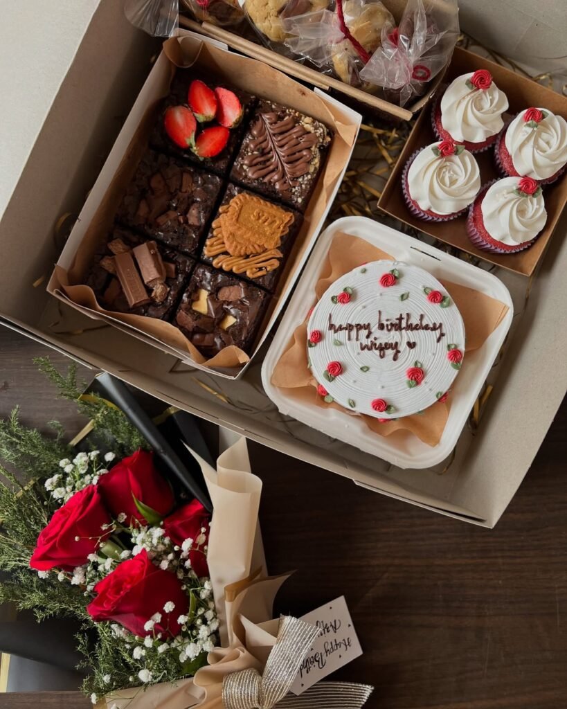 A delectable “HBD Wifey” cake, beautifully presented in a clear display box adorned with fairy lights, promises a sweet indulgence. This personal touch makes the moment even more memorable, creating a delightful surprise. Sharing a delicious cake is a classic wife birthday gift idea.